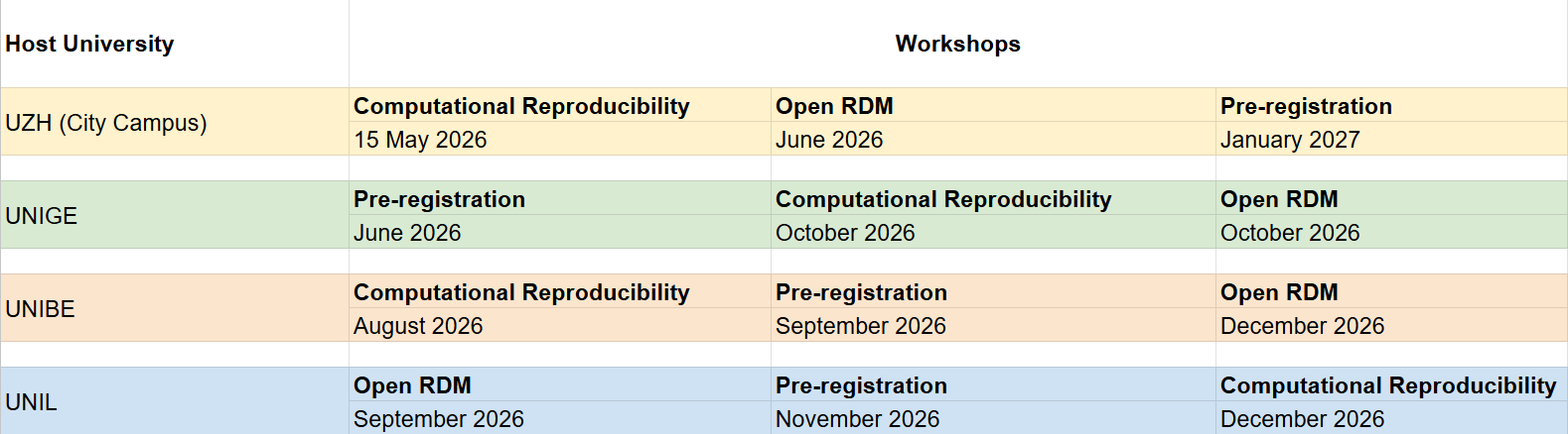 The project delivers three itinerant, hands-on workshops on reproducibility, pre-registration, and open research data management. Each workshop will be hosted at four Swiss universities (UZH, UNIGE, UNIBE and UNIL) and combines conceptual grounding with practical training.